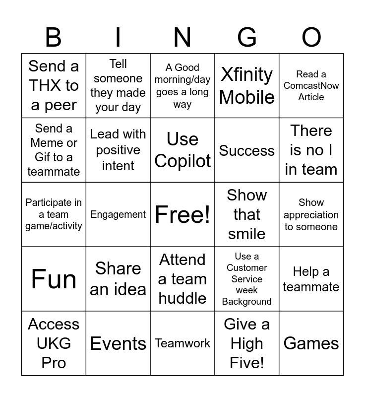 This bingo card has a free space and 25 words: Share an idea, Teamwork, Use Copilot, Access UKG Pro, Read a ComcastNow Article, Send a THX to a peer, Send a Meme or Gif to a teammate, Tell someone they made your day, Show that smile, Attend a team huddle, Success, Participate in a team game/activity, Use a Customer Service week Background, Help a teammate, Lead with positive intent, Look at the Brightside, Show appreciation to someone, A Good morning/day goes a long way, There is no I in team, Engagement, Games, Events, Fun, Xfinity Mobile and Give a High Five!.