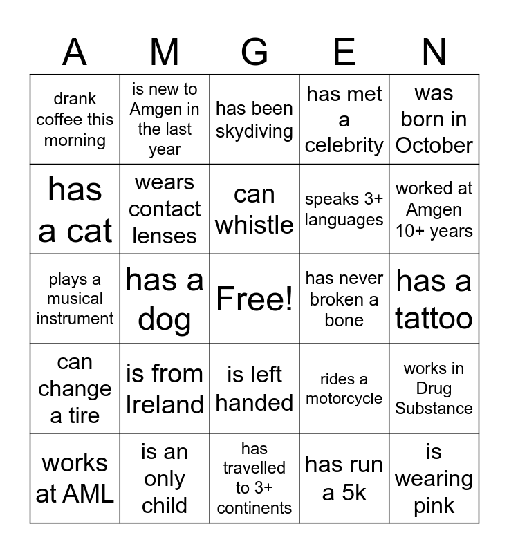 This bingo card has a free space and 24 words: is from Ireland, is an only child, can whistle, works at AML, was born in October, drank coffee this morning, has a cat, is new to Amgen in the last year, has never broken a bone, is left handed, speaks 3+ languages, plays a musical instrument, rides a motorcycle, works in Drug Substance, wears contact lenses, has run a 5k, has a tattoo, has been skydiving, worked at Amgen 10+ years, has a dog, is wearing pink, can change a tire, has met a celebrity and has travelled to 3+ continents.