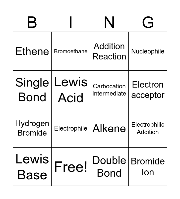 This bingo card has 16 words: Free!, Electrophilic Addition, Addition Reaction, Ethene, Hydrogen Bromide, Bromoethane, Alkene, Double Bond, Single Bond, Lewis Acid, Lewis Base, Nucleophile, Electrophile, Electron acceptor, Carbocation Intermediate and Bromide Ion.