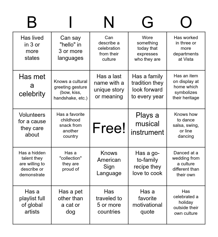 This bingo card has a free space and 24 words: Has a "collection" they are proud of, Has a pet other than a cat or dog, Has a last name with a unique story or meaning, Has a playlist full of global artists, Has worked in three or more departments at Vista, Has lived in 3 or more states, Has met a celebrity, Can say "hello" in 3 or more languages, Plays a musical instrument, Knows American Sign Language, Has a family tradition they look forward to every year, Volunteers for a cause they care about, Has a go-to-family recipe they love to cook, Danced at a wedding from a culture different than their own, Knows a cultural greeting gesture (bow, kiss, handshake, etc.), Has a favorite motivational quote, Knows how to dance salsa, swing, or line dancing, Can describe a celebration from their culture, Has an item on display at home which symbolizes their heritage, Has a favorite childhood snack from another country, Has celebrated a holiday outside their own culture, Has a hidden talent they are willing to describe or demonstrate, Wore something today that expresses who they are and Has traveled to 5 or more countries.