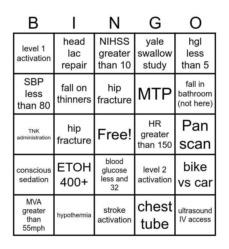 This bingo card has a free space and 24 words: ETOH 400+, hypothermia, hip fracture, MVA greater than 55mph, hgl less than 5, level 1 activation, SBP less than 80, head lac repair, HR greater than 150, blood glucose less and 32, MTP, TNK administration, level 2 activation, bike vs car, fall on thinners, chest tube, Pan scan, NIHSS greater than 10, fall in bathroom (not here), hip fracture, ultrasound IV access, conscious sedation, yale swallow study and stroke activation.