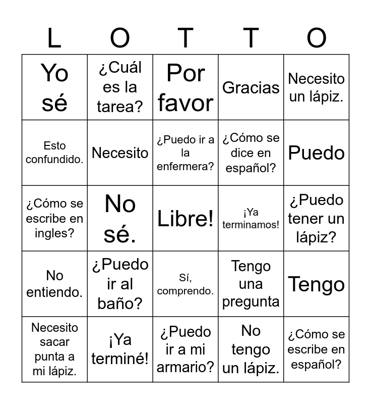 This bingo card has a free space and 25 words: ¿Puedo ir al baño?, ¿Puedo ir a mi armario?, ¿Puedo ir a la enfermera?, Necesito sacar punta a mi lápiz., Necesito un lápiz., Yo sé, Esto confundido., ¿Cuál es la tarea?, ¡Ya terminamos!, Sí, comprendo., ¿Cómo se dice en español?, ¿Cómo se escribe en ingles?, Tengo una pregunta, Tengo, Necesito, ¿Qué significa...?, ¿Puedo tener un lápiz?, Por favor, Puedo, No sé., ¿Cómo se escribe en español?, ¡Ya terminé!, No entiendo., Gracias and No tengo un lápiz..