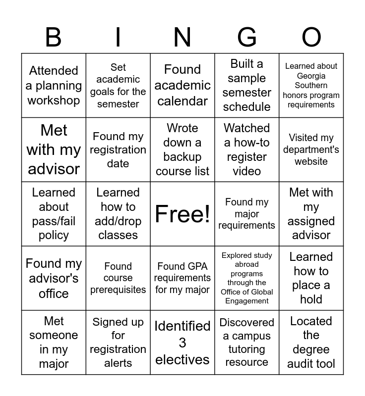 This bingo card has a free space and 28 words: Learned how to place a hold, Found my unofficial transcript, Watched a how-to register video, Discovered a campus tutoring resource, Met with my advisor, Found academic calendar, Set academic goals for the semester, Found my advisor's office, Found my major requirements, Met someone in my major, Learned about pass/fail policy, Built a sample semester schedule, Signed up for registration alerts, Identified 3 electives, Visited my department's website, Checked when I need to declare a major, Found course prerequisites, Found my registration date, Wrote down a backup course list, Found GPA requirements for my major, Attended a planning workshop, Joined a major-related student org, Located the degree audit tool, Learned how to add/drop classes, Met with my assigned advisor, Explored study abroad programs through the Office of Global Engagement, Learned about Georgia Southern honors program requirements and Learned about campus learning support services.