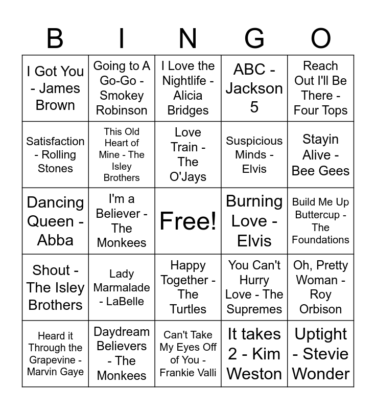 This bingo card has a free space and 41 words: I Want You Back - Jackson 5, Dancing Queen - Abba, Hang on Sloopy - The McCoys, This Old Heart of Mine - The Isley Brothers, Daydream Believers - The Monkees, Happy Together - The Turtles, Love Train - The O'Jays, I Will Survive - Gloria Gaynor, Reach Out I'll Be There - Four Tops, Shout - The Isley Brothers, I'm a Believer - The Monkees, ABC - Jackson 5, Uptight - Stevie Wonder, Build Me Up Buttercup - The Foundations, Burning Love - Elvis, Lady Marmalade - LaBelle, Louie Louie - The Kingsmen, I Got You - James Brown, Sweet Caroline - Neil Diamond, I Love the Nightlife - Alicia Bridges, Oh, Pretty Woman - Roy Orbison, In The Midnight Hour - Wilson Pickett, Can't Take My Eyes Off of You - Frankie Valli, Suspicious Minds - Elvis, We Are Family - Sister Sledge, Chapel of Love - The Dixie Cups, It takes 2 - Kim Weston, Dance To the Music - Sly & the Family Stone, Stayin Alive - Bee Gees, My Girl - The Temptations, Stop in the Name of Love - The Supremes, Going to A Go-Go - Smokey Robinson, Heard it Through the Grapevine - Marvin Gaye, Please Mr Postman - The Marvelettes, You Can't Hurry Love - The Supremes, Satisfaction - Rolling Stones, Johnny B. Goode - Chuck Berry, My Guy - Mary Welles, Get Ready - The Temptations, I Want To Hold Your Hand - The Beatles and Proud Mary - Tina Turner.