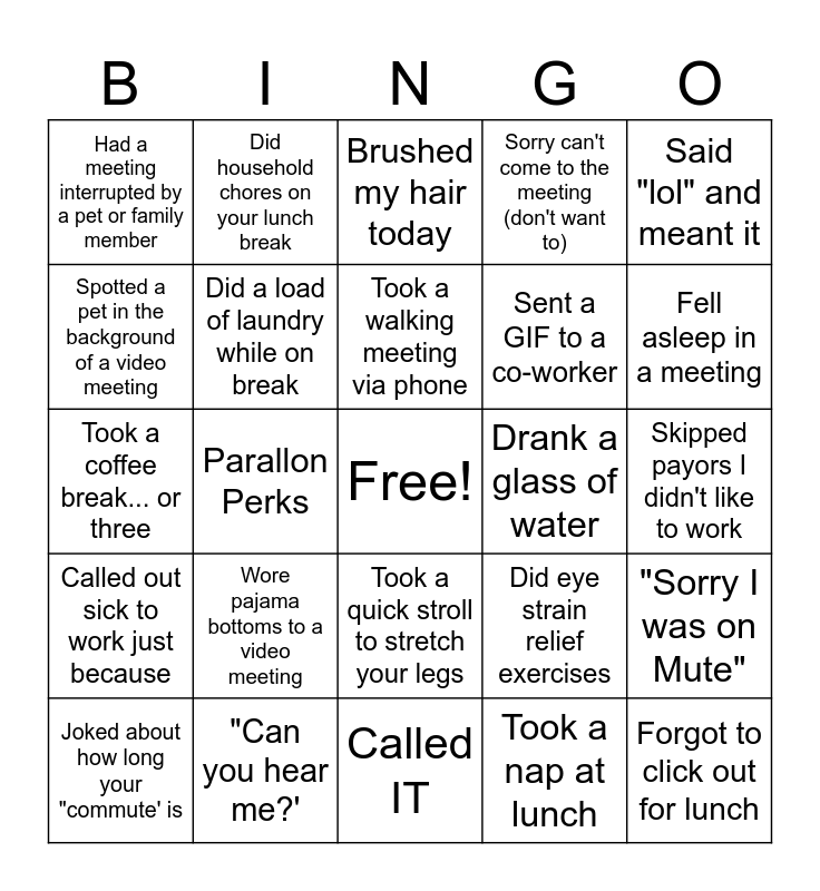 This bingo card has a free space and 24 words: Wore pajama bottoms to a video meeting, "Can you hear me?', Took a walking meeting via phone, Joked about how long your "commute' is, Said "lol" and meant it, Had a meeting interrupted by a pet or family member, Spotted a pet in the background of a video meeting, Did household chores on your lunch break, Drank a glass of water, Took a quick stroll to stretch your legs, Sent a GIF to a co-worker, Took a coffee break... or three, Did eye strain relief exercises, "Sorry I was on Mute", Did a load of laundry while on break, Took a nap at lunch, Skipped payors I didn't like to work, Brushed my hair today, Fell asleep in a meeting, Parallon Perks, Forgot to click out for lunch, Called out sick to work just because, Sorry can't come to the meeting (don't want to) and Called IT.