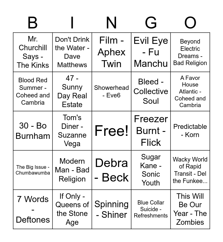 This bingo card has a free space and 41 words: Little Dipper - Hum, 30 - Bo Burnham, The Decline - NOFX, 47 - Sunny Day Real Estate, If Only - Queens of the Stone Age, Debra - Beck, Showerhead - Eve6, Death Blooms - Mudvayne, Beyond Electric Dreams - Bad Religion, The Big Issue - Chumbawumba, Tom's Diner - Suzanne Vega, Evil Eye - Fu Manchu, This Will Be Our Year - The Zombies, Predictable - Korn, Freezer Burnt - Flick, Modern Man - Bad Religion, Disconnected - Goo Goo Dolls, Mr. Churchill Says - The Kinks, Wrapped Around your Finger - Police, Film - Aphex Twin, Wacky World of Rapid Transit - Del the Funkee..., No Complaints - Beck, Spinning - Shiner, Bleed - Collective Soul, Naked Pictures - Electric Six, Old Hat - Harvey Danger, Blue Collar Suicide - Refreshments, Mr Golden Deal - Tonic, A Favor House Atlantic - Coheed and Cambria, Bezos 1 - Bo Burnham, Gay Bar - Electric Six, Don't Drink the Water - Dave Matthews, 7 Words - Deftones, Lights - Journey, Sugar Kane - Sonic Youth, Blood Red Summer - Coheed and Cambria, Come On - Goo Goo Dolls, Good Bye Sky Harbor - Jimmy Eat World, Lizzy - Ben Kweller, Thank You - Alanis Morrisette and Poppies - Macy Playground.