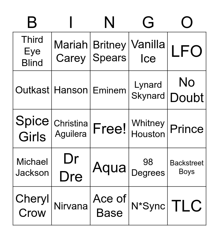 This bingo card has a free space and 24 words: Dr Dre, Nirvana, Eminem, Cheryl Crow, LFO, Third Eye Blind, Outkast, Mariah Carey, Whitney Houston, Aqua, Lynard Skynard, Spice Girls, 98 Degrees, Backstreet Boys, Hanson, N*Sync, Prince, Britney Spears, No Doubt, Christina Aguilera, TLC, Michael Jackson, Vanilla Ice and Ace of Base.