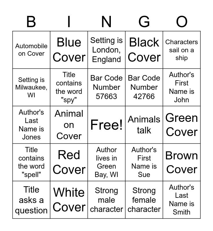 This bingo card has a free space and 24 words: Red Cover, White Cover, Bar Code Number 57663, Title asks a question, Characters sail on a ship, Automobile on Cover, Setting is Milwaukee, WI, Blue Cover, Animals talk, Author lives in Green Bay, WI, Bar Code Number 42766, Author's Last Name is Jones, Author's First Name is Sue, Brown Cover, Title contains the word "spy", Strong female character, Green Cover, Setting is London, England, Author's First Name is John, Animal on Cover, Author's Last Name is Smith, Title contains the word "spell", Black Cover and Strong male character.