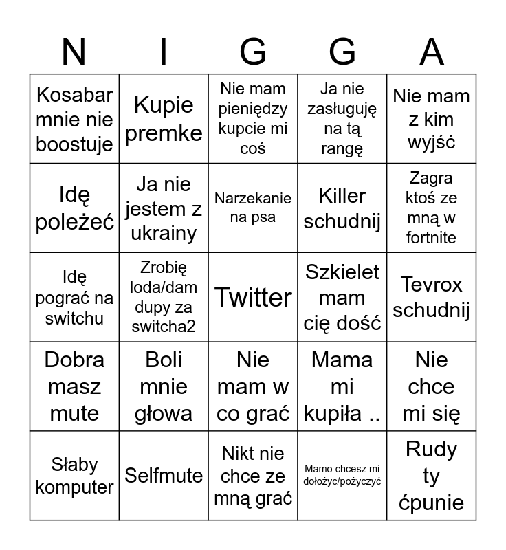 This bingo card has a free space and 24 words: Boli mnie głowa, Selfmute, Narzekanie na psa, Słaby komputer, Nie mam z kim wyjść, Kosabar mnie nie boostuje, Idę poleżeć, Kupie premke, Szkielet mam cię dość, Nie mam w co grać, Killer schudnij, Idę pograć na switchu, Mama mi kupiła .., Nie chce mi się, Ja nie jestem z ukrainy, Mamo chcesz mi dołożyc/pożyczyć, Tevrox schudnij, Nie mam pieniędzy kupcie mi coś, Zagra ktoś ze mną w fortnite, Zrobię loda/dam dupy za switcha2, Rudy ty ćpunie, Dobra masz mute, Ja nie zasługuję na tą rangę and Nikt nie chce ze mną grać.