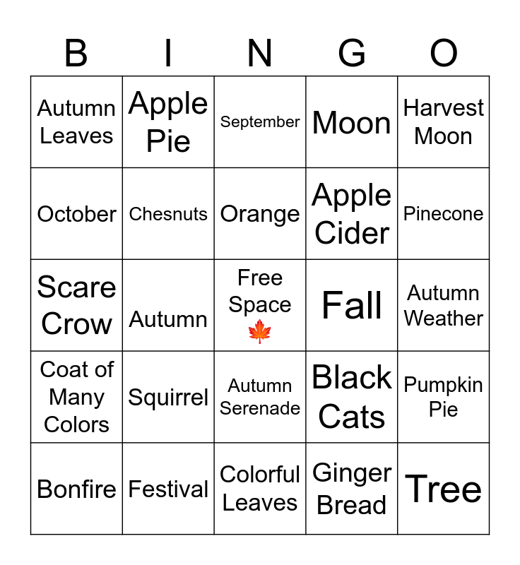 This bingo card has a free space and 29 words: Bonfire, Pumpkin, Autumn, Harvest, Autumn Leaves, September, Chesnuts, Squirrel, Fall, Festival, Autumn Weather, Tree, Colorful Leaves, Ginger Bread, Pinecone, Harvest Moon, Autumn Serenade, Coat of Many Colors, Harvest Moon, Scare Crow, Black Cats, Hedgehog, Apple Cider, October, Moon, Apple Pie, Pumpkin Pie, Orange and Yellow.