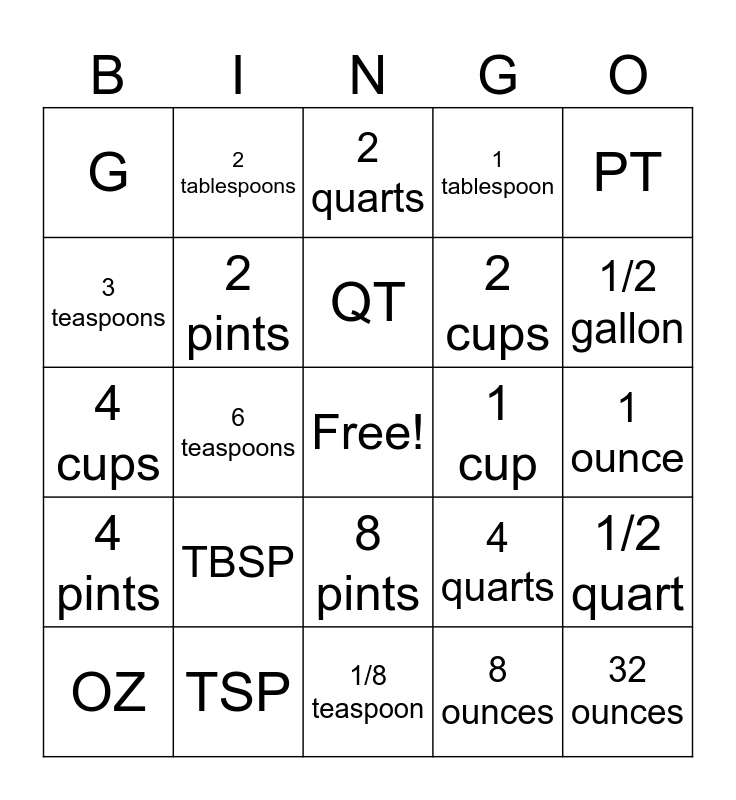 This bingo card has a free space and 24 words: TBSP, TSP, QT, OZ, PT, G, 3 teaspoons, 2 tablespoons, 1 cup, 8 pints, 2 cups, 4 cups, 4 quarts, 1/2 quart, 2 pints, 8 ounces, 1 ounce, 2 quarts, 1/2 gallon, 6 teaspoons, 32 ounces, 4 pints, 1 tablespoon and 1/8 teaspoon.