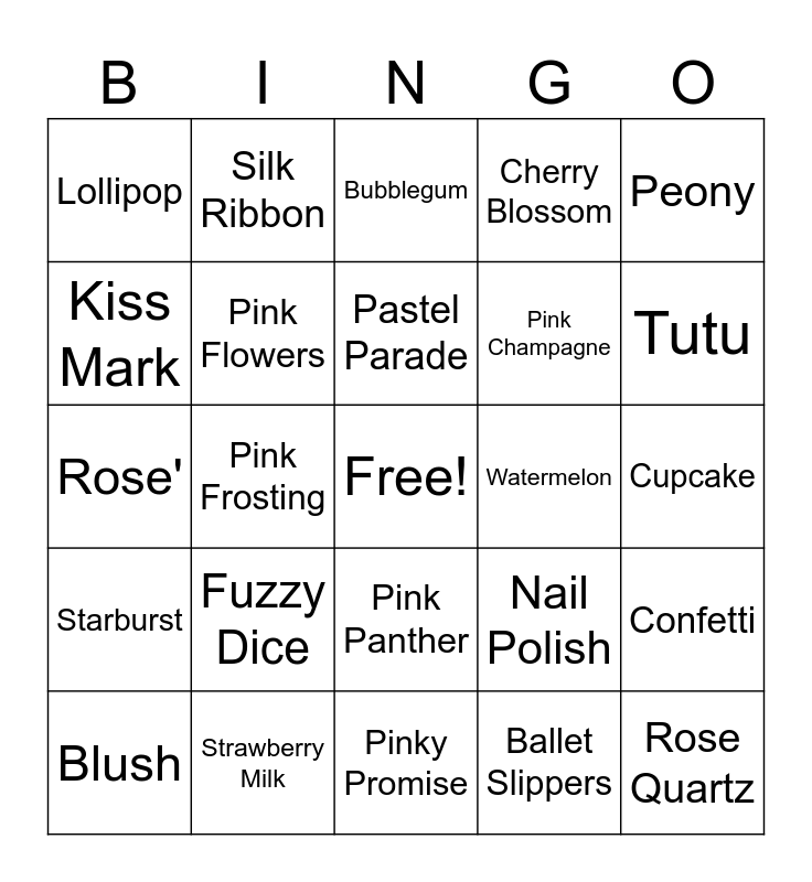 This bingo card has a free space and 44 words: Cotton Candy, Rose Quartz, Flamingo, Blush, Lip Gloss, Ballet Slippers, Bubblegum, Barbie, Peony, Strawberry Milk, Cherry Blossom, Watermelon, Pink Panther, Fuzzy Dice, Love Letter, Pinky Promise, Glitter, Rose', Pink Lemonade, Tutu, Silk Ribbon, Pink Sky, Blush Brush, Lollipop, petals, Cupcake, Heart-shaped Glasses, Cherry Lip Balm, Nail Polish, Starburst, Piglet, Confetti, Crushed Velvet, Feather Boa, Pink Frosting, Mood Ring, Birthday Girl, Eraser, Pastel Parade, Kiss Mark, Pink Champagne, Hello Kitty, Pink Flowers and Pink Sugar.