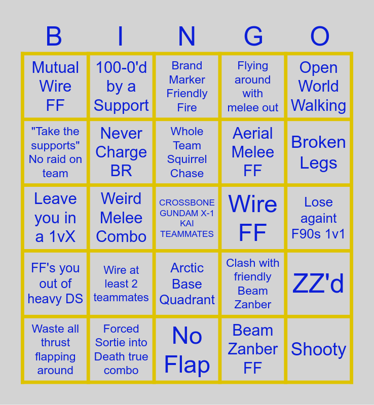 This bingo card has a free space and 24 words: Waste all thrust flapping around, Wire at least 2 teammates, Whole Team Squirrel Chase, Beam Zanber FF, Open World Walking, Mutual Wire FF, 100-0'd by a Support, Brand Marker Friendly Fire, Wire FF, Lose againt F90s 1v1, Leave you in a 1vX, Never Charge BR, Clash with friendly Beam Zanber, ZZ'd, "Take the supports" No raid on team, Forced Sortie into Death true combo, No Flap, Flying around with melee out, Broken Legs, FF's you out of heavy DS, Weird Melee Combo, Arctic Base Quadrant, Aerial Melee FF and Shooty.