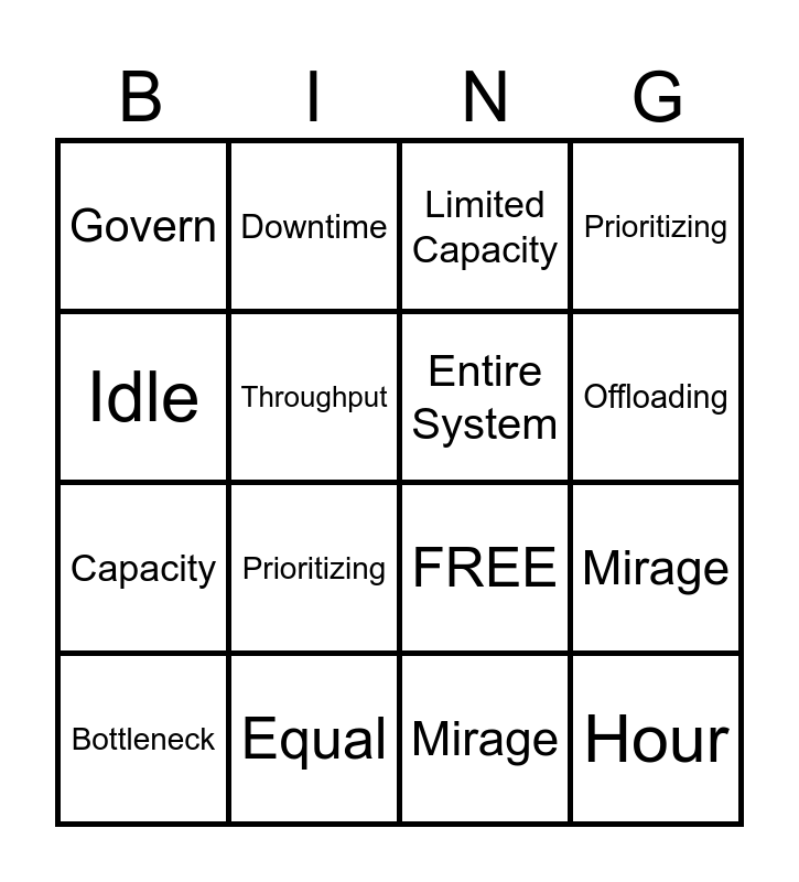 This bingo card has 21 words: Equal, Bottleneck, Downtime, Defective Parts, Mirage, Entire System, Govern, Limited Capacity, FREE, Offloading, Capacity, Prioritizing, Hour, Idle, Throughput, Quality Checks, Bottleneck, Prioritizing, Idle, Mirage and Downtime.