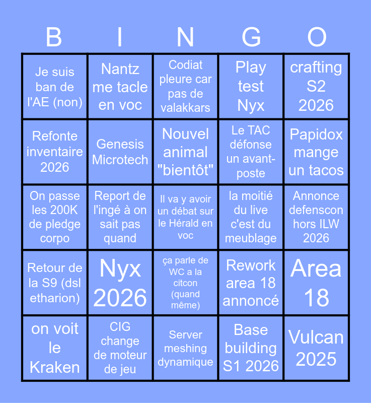 This bingo card has a free space and 24 words: Nyx 2026, CIG change de moteur de jeu, Nouvel animal "bientôt", on voit le Kraken, crafting S2 2026, Je suis ban de l'AE (non), Refonte inventaire 2026, Nantz me tacle en voc, la moitié du live c'est du meublage, ça parle de WC a la citcon (quand même), Le TAC défonse un avant-poste, On passe les 200K de pledge corpo, Rework area 18 annoncé, Area 18, Genesis Microtech, Base building S1 2026, Annonce defenscon hors ILW 2026, Codiat pleure car pas de valakkars, Papidox mange un tacos, Report de l'ingé à on sait pas quand, Vulcan 2025, Retour de la S9 (dsl etharion), Play test Nyx and Server meshing dynamique.