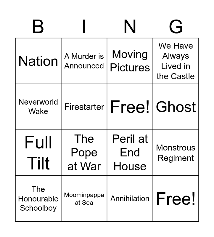 This bingo card has 16 words: Moominpappa at Sea, Monstrous Regiment, Moving Pictures, Nation, Full Tilt, A Murder is Announced, Peril at End House, Annihilation, Neverworld Wake, Firestarter, The Honourable Schoolboy, We Have Always Lived in the Castle, The Pope at War, Ghost, Free! and Free!.