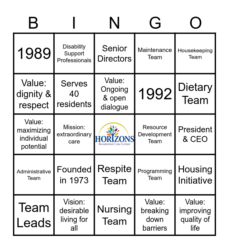 This bingo card has a free space and 24 words: Founded in 1973, Vision: desirable living for all, Value: Ongoing & open dialogue, Team Leads, Housekeeping Team, 1989, Value: dignity & respect, Disability Support Professionals, Resource Development Team, Respite Team, 1992, Value: maximizing individual potential, Programming Team, Housing Initiative, Serves 40 residents, Value: breaking down barriers, President & CEO, Senior Directors, Dietary Team, Mission: extraordinary care, Value: improving quality of life, Administrative Team, Maintenance Team and Nursing Team.