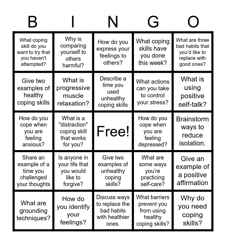 This bingo card has a free space and 35 words: How can you incorporate coping skills into your daily routine?, Do you avoid probelms when they arise? Do you think this is a healthy coping skill?, What coping skills have you tried that didn't work?, What is progressive muscle relaxation?, Give two examples of unhealthy coping skills?, What coping skills have you done this week?, Give two examples of healthy coping skills, How do you think your negative thoughts influence your behavior?, Describe a time you used unhealthy coping skills, How do you cope when you are feeling angry?, How do you cope when you are feeling anxious?, What are three bad habits that you’d like to replace with good ones?, What coping skills work best for you?, Describe a time you used healthy coping skills. How did it make you feel after?, What coping skill do you want to try that you haven't attempted?, How do you cope when you are feeling depressed?, What barriers prevent you from using healthy coping skills?, What is a "distraction" coping skill that works for you?, Share an example of a time you challenged your thoughts, Why do you need coping skills?, What are some ways you’re practicing self-care?, What are grounding techniques?, Give an example of a positive affirmation, How do you identify your feelings?, How do you express your feelings to others?, What is using positive self-talk?, What is your favorite coping skill?, How much alone time do you think you give yourself every day?, What actions can you take to control your stress?, Brainstorm ways to reduce isolation., What are the benefits of living in the present moment?, Discuss ways to replace the bad habits with healthier ones., Is anyone in your life that you would like to forgive?, Why is comparing yourself to others harmful? and Name three things that you can journal about..