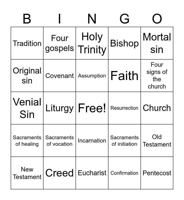 This bingo card has a free space and 30 words: Creed, Prayer, Liturgy, Scripture, Tradition, Holy Trinity, Covenant, Incarnation, Resurrection, Eucharist, Church, Pentecost, Confirmation, WRUCKWAR, Four signs of the church, Jewish people, Sacraments of initiation, Sacraments of healing, Sacraments of vocation, Mortal sin, Venial Sin, Catholic, Four gospels, Faith, Original sin, Bishop, Old Testament, New Testament, Assumption and Mother of God.