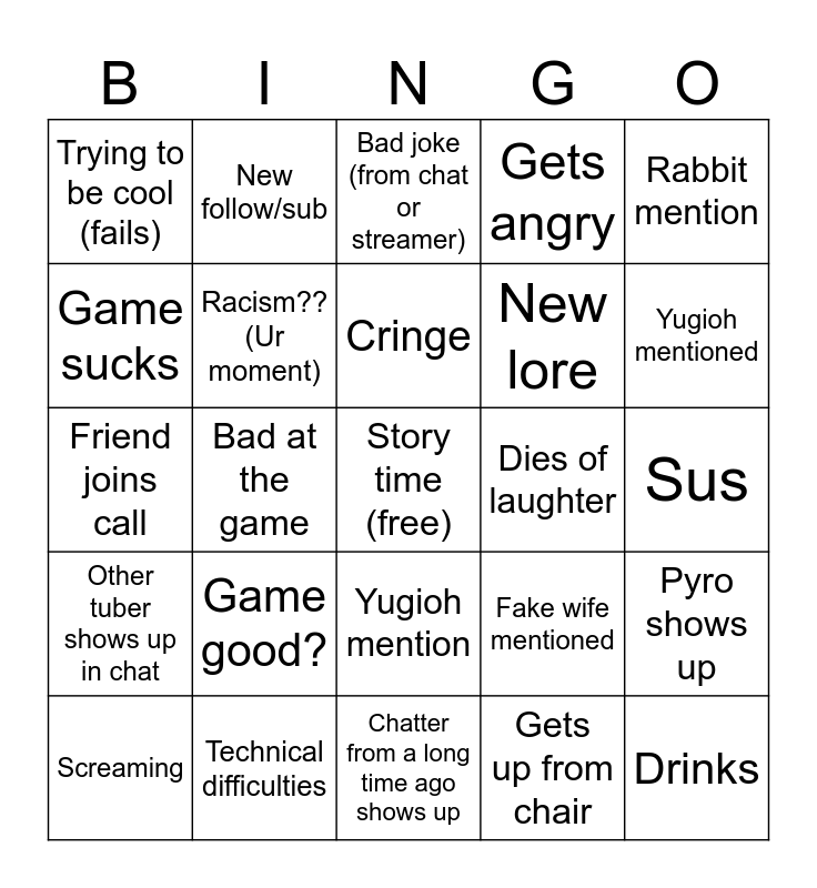 This bingo card has a free space and 24 words: Game good?, Technical difficulties, Cringe, Screaming, Rabbit mention, Trying to be cool (fails), Game sucks, New follow/sub, Dies of laughter, Yugioh mention, New lore, Friend joins call, Fake wife mentioned, Pyro shows up, Racism?? (Ur moment), Gets up from chair, Sus, Bad joke (from chat or streamer), Yugioh mentioned, Bad at the game, Drinks, Other tuber shows up in chat, Gets angry and Chatter from a long time ago shows up.