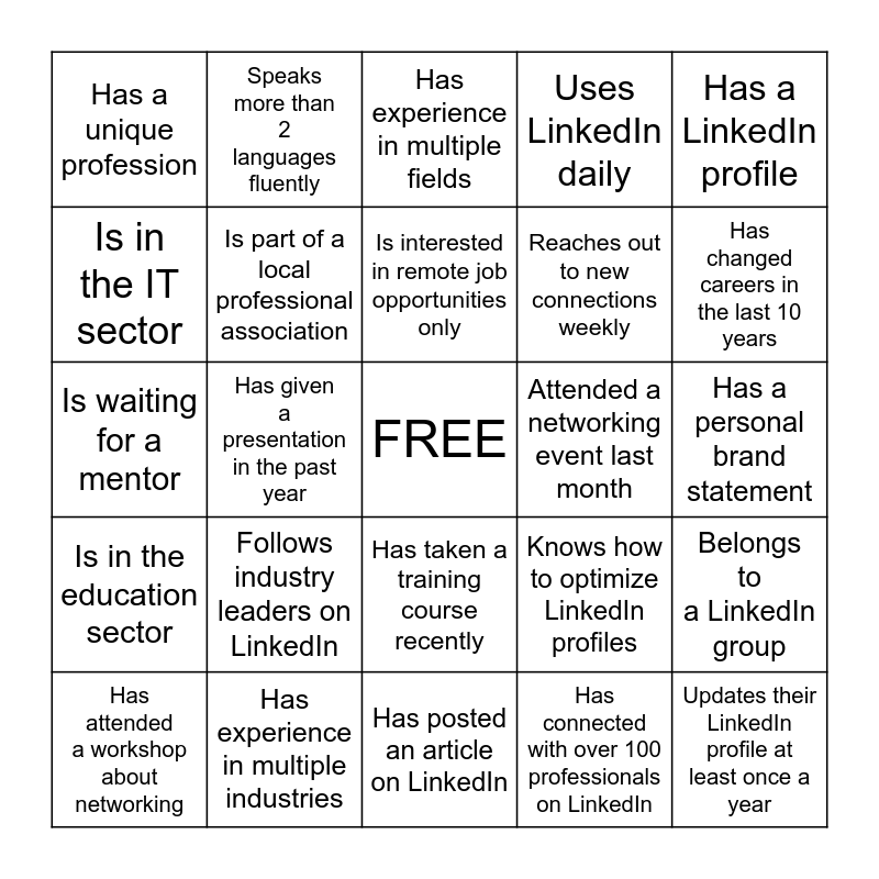 This bingo card has a free space and 24 words: Follows industry leaders on LinkedIn, Has experience in multiple industries, Is interested in remote job opportunities only, Has attended a workshop about networking, Has a LinkedIn profile, Has a unique profession, Is in the IT sector, Speaks more than 2 languages fluently, Attended a networking event last month, Has taken a training course recently, Reaches out to new connections weekly, Is waiting for a mentor, Knows how to optimize LinkedIn profiles, Belongs to a LinkedIn group, Is part of a local professional association, Has connected with over 100 professionals on LinkedIn, Has a personal brand statement, Has experience in multiple fields, Has changed careers in the last 10 years, Has given a presentation in the past year, Updates their LinkedIn profile at least once a year, Is in the education sector, Uses LinkedIn daily and Has posted an article on LinkedIn.