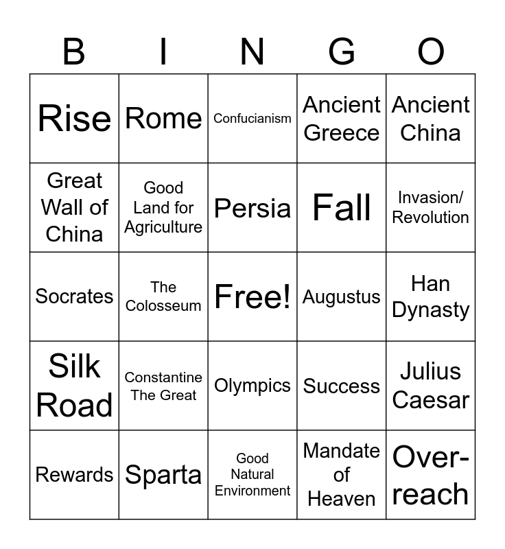 This bingo card has a free space and 26 words: Olympics, Mandate of Heaven, Persia, Sparta, Ancient China, Rise, Great Wall of China, Rome, Han Dynasty, Success, Fall, Socrates, Julius Caesar, Rewards, The Colosseum, Direct Democracy, Ancient Greece, Silk Road, Confucianism, Over-reach, Invasion/ Revolution, Good Natural Environment, Augustus, Constantine The Great, Good Land for Agriculture and Economic Reward.