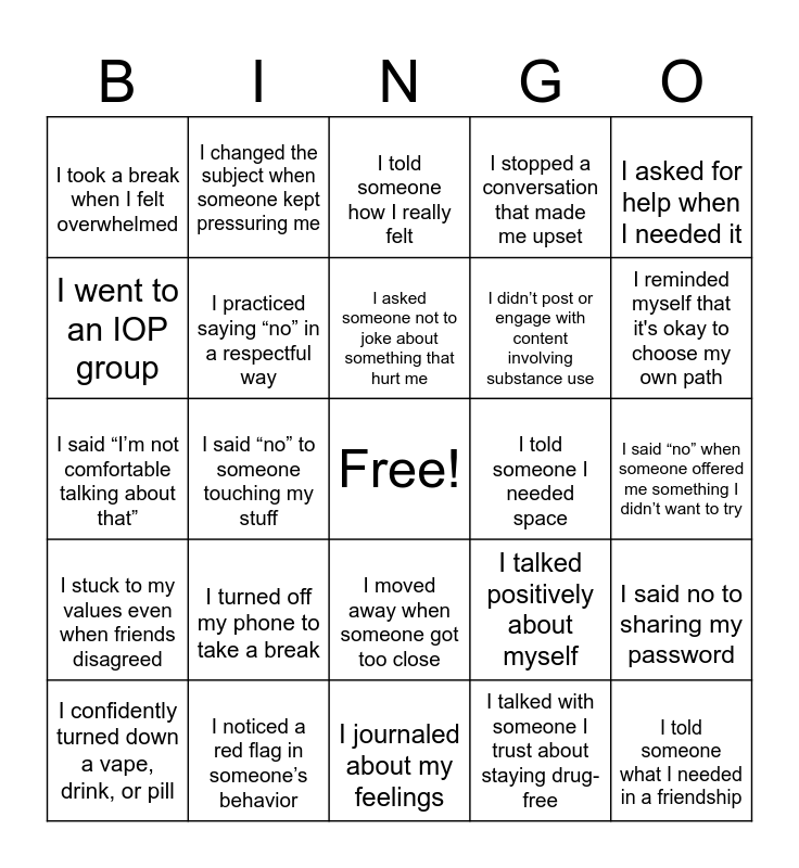 This bingo card has a free space and 41 words: I asked before hugging someone, I said “I’m not comfortable talking about that”, I took time to be alone and practice self care, I practiced saying “no” in a respectful way, I noticed a red flag in someone’s behavior, I moved away when someone got too close, I asked someone not to joke about something that hurt me, I chose not to multitask when I needed to focus, I asked for help when I needed it, I stuck to my values even when friends disagreed, I said “no” to someone touching my stuff, I stopped a conversation that made me upset, I told someone what I needed in a friendship, I said “no” when someone offered me something I didn’t want to try, I told someone I needed space, I turned off my phone to take a break, I gave someone space when they seemed overwhelmed, I took a break when I felt overwhelmed, I walked away from a situation where substances were being used, I told someone how I really felt, I said no to sharing my password, I used “I” statements to express myself, I journaled about my feelings, I didn’t post or engage with content involving substance use, I used social media to share something positive or healthy instead, I unfollowed someone who posted pictures of drugs/alcohol, I talked with someone I trust about staying drug-free, I noticed how I feel around people who push boundaries, I reminded myself that it's okay to choose my own path, I told someone I don’t drink/use and asked them to respect that, I stood up for a friend who was being pressured to use, I changed the subject when someone kept pressuring me, I confidently turned down a vape, drink, or pill, I didn’t take on someone else’s emotional burden, I talked positively about myself, I went to an IOP group, I had a positive interaction with a parent/guardian, I used an affirmation, I practiced my breathwork, I used a coping skill when I was upset and I picked up a hobby.