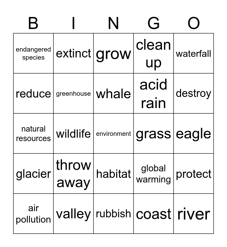 This bingo card has a free space and 24 words: throw away, valley, whale, air pollution, waterfall, endangered species, reduce, extinct, grass, habitat, acid rain, natural resources, global warming, protect, greenhouse, coast, eagle, grow, destroy, wildlife, river, glacier, clean up and rubbish.