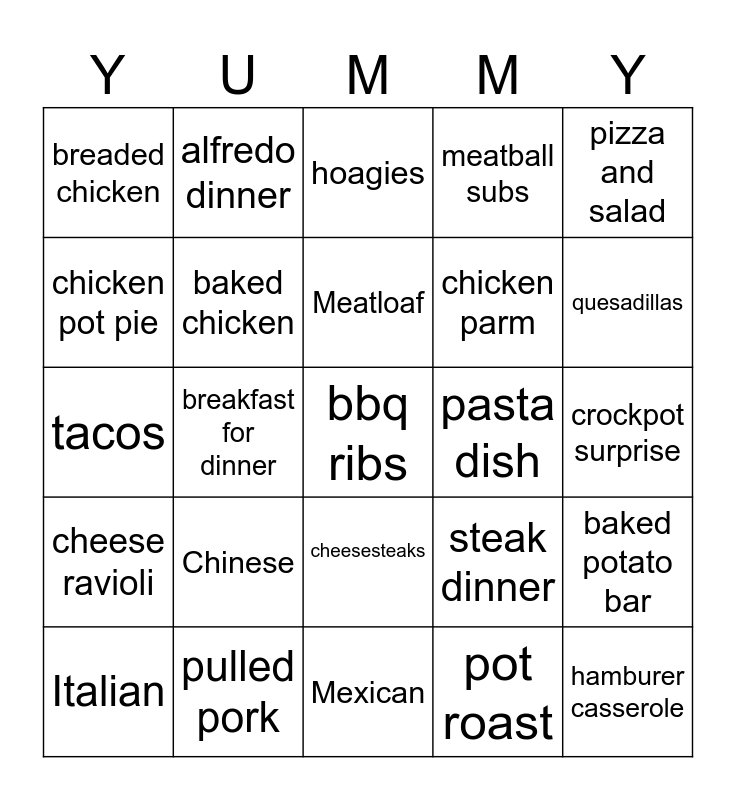 This bingo card has 25 words: Chinese, Mexican, Meatloaf, Italian, pizza and salad, breaded chicken, chicken pot pie, alfredo dinner, pasta dish, cheesesteaks, chicken parm, tacos, steak dinner, baked potato bar, baked chicken, hamburer casserole, crockpot surprise, hoagies, quesadillas, breakfast for dinner, bbq ribs, pulled pork, cheese ravioli, meatball subs and pot roast.