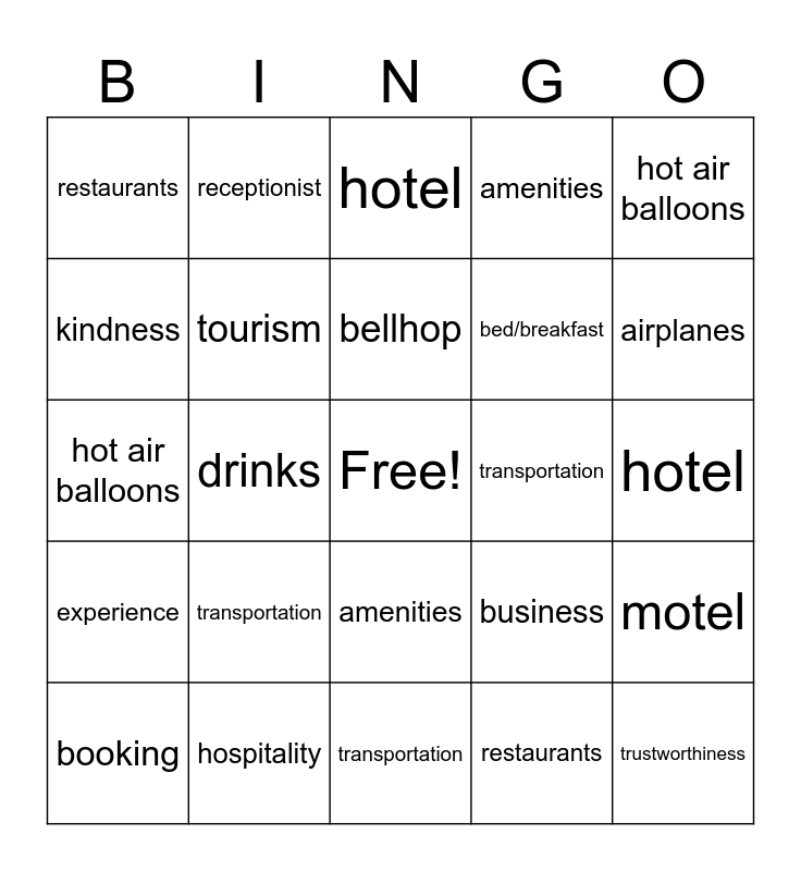 ⚠ This card has duplicate items: hospitality (3), trustworthiness (3), motel (3), responsibility (2), airplanes (2), accountability (3), receptionist (3), food (2), bellhop (3), service (3), amenities (2), concierge (3), hotel (3), hot air balloons (3), booking (2), kindness (3), drinks (3), restaurants (3), tourism (3), transportation (3), bed/breakfast (3), business (3), experience (3), airbnb (2), Free! (2)