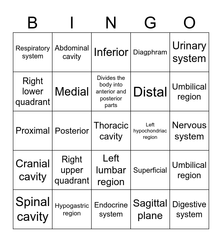 This bingo card has 30 words: Hypogastric region, Anterior, Posterior, Circulatory system, Respiratory system, Inferior, Medial, Left lumbar region, Left hypochondriac region, Endocrine system, Nervous system, Thoracic cavity, Sagittal plane, Digestive system, Umbilical region, Superior, Superficial, Cranial cavity, Right upper quadrant, Urinary system, Proximal, Lateral, Abdominal cavity, Distal, Right lower quadrant, Diagphram, Umbilical region, Spinal cavity, Divides the body into anterior and posterior parts and Righgt inguinal region.