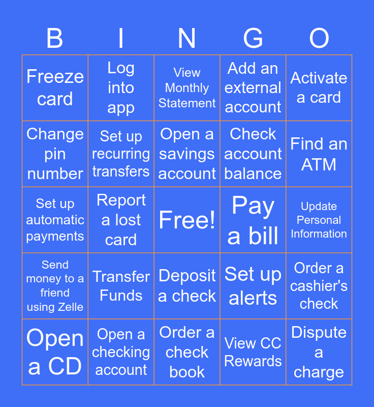 This bingo card has a free space and 24 words: Transfer Funds, Open a checking account, Open a savings account, Open a CD, Activate a card, Freeze card, Change pin number, Log into app, Pay a bill, Deposit a check, Check account balance, Set up automatic payments, Set up alerts, Order a cashier's check, Set up recurring transfers, View CC Rewards, Update Personal Information, View Monthly Statement, Find an ATM, Report a lost card, Dispute a charge, Send money to a friend using Zelle, Add an external account and Order a check book.