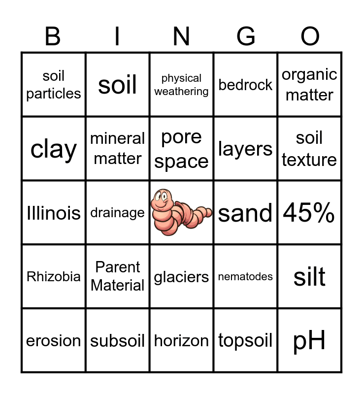 This bingo card has a free space and 24 words: Parent Material, subsoil, pore space, erosion, organic matter, soil particles, clay, soil, sand, glaciers, layers, Illinois, nematodes, silt, mineral matter, topsoil, 45%, physical weathering, soil texture, drainage, pH, Rhizobia, bedrock and horizon.