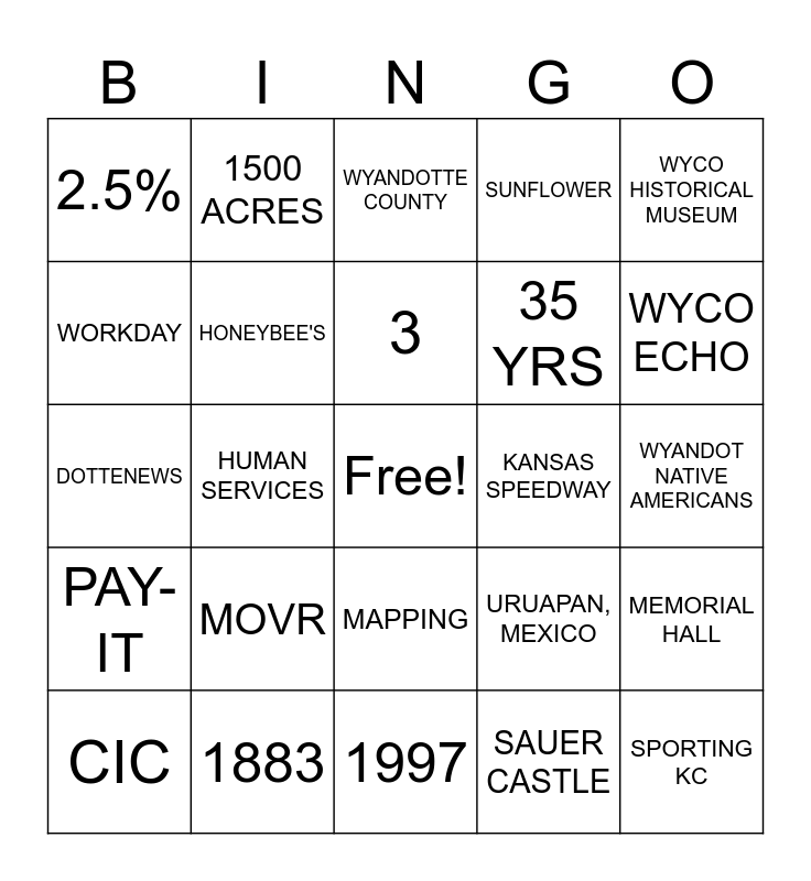 This bingo card has a free space and 24 words: CIC, MOVR, 3, SAUER CASTLE, WYCO HISTORICAL MUSEUM, 2.5%, 1500 ACRES, WYANDOTTE COUNTY, KANSAS SPEEDWAY, WYANDOT NATIVE AMERICANS, DOTTENEWS, HONEYBEE'S, URUAPAN, MEXICO, MEMORIAL HALL, WORKDAY, 1883, 1997, SUNFLOWER, WYCO ECHO, PAY-IT, HUMAN SERVICES, MAPPING, 35 YRS and SPORTING KC.
