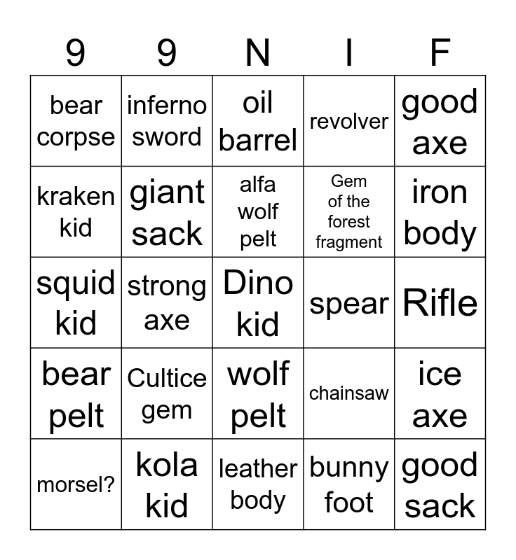 This bingo card has a free space and 24 words: Cultice gem, kola kid, alfa wolf pelt, morsel?, good axe, bear corpse, kraken kid, inferno sword, spear, wolf pelt, Gem of the forest fragment, squid kid, chainsaw, ice axe, giant sack, bunny foot, Rifle, oil barrel, iron body, strong axe, good sack, bear pelt, revolver and leather body.