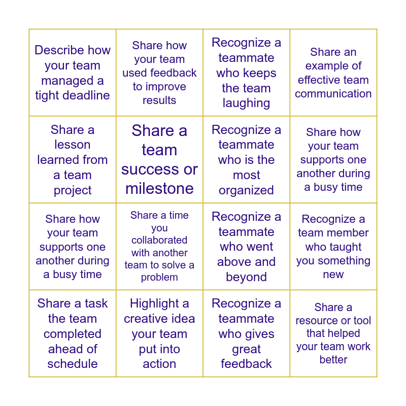 This bingo card has 16 words: Share a task the team completed ahead of schedule, Highlight a creative idea your team put into action, Recognize a teammate who keeps the team laughing, Share an example of effective team communication, Share a lesson learned from a team project, Share how your team used feedback to improve results, Recognize a teammate who went above and beyond, Recognize a team member who taught you something new, Describe how your team managed a tight deadline, Share a team success or milestone, Recognize a teammate who gives great feedback, Share how your team supports one another during a busy time, Share how your team supports one another during a busy time, Share a time you collaborated with another team to solve a problem, Recognize a teammate who is the most organized and Share a resource or tool that helped your team work better.