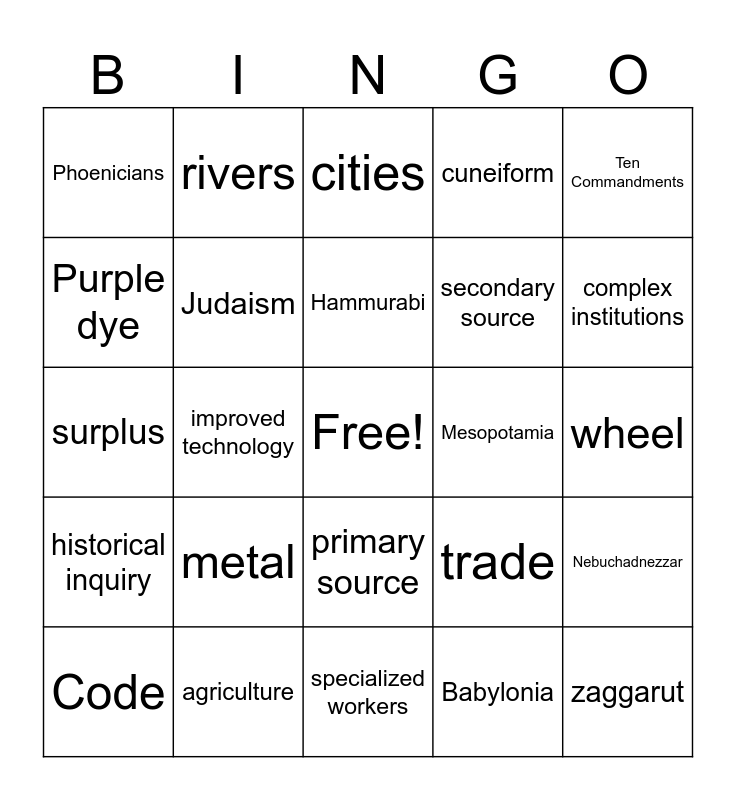 This bingo card has a free space and 24 words: metal, agriculture, Hammurabi, Code, Ten Commandments, Phoenicians, Purple dye, rivers, Mesopotamia, primary source, secondary source, surplus, trade, Nebuchadnezzar, Judaism, Babylonia, wheel, cities, complex institutions, improved technology, zaggarut, historical inquiry, cuneiform and specialized workers.
