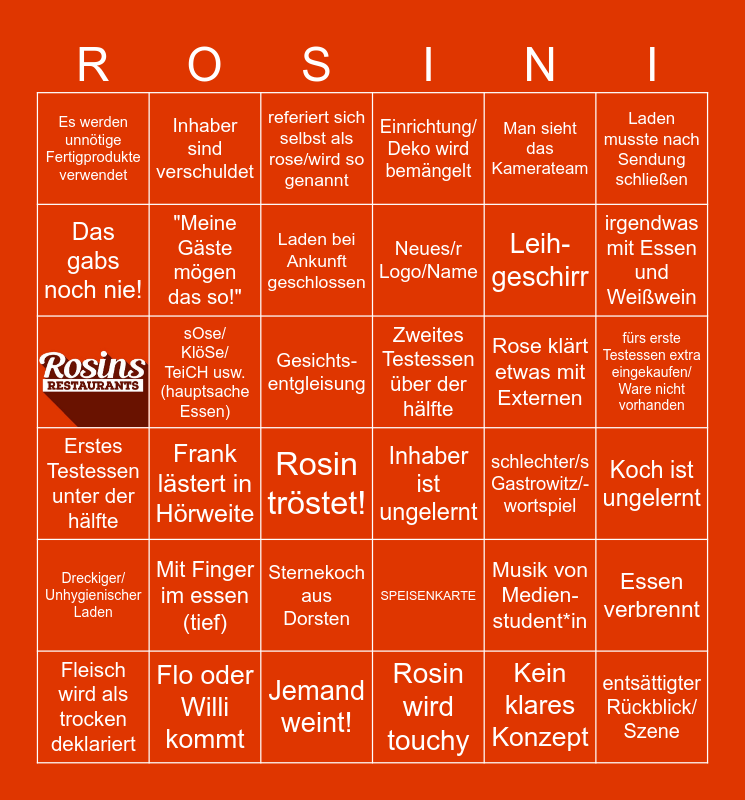 This bingo card has 1 images and 35 words: SPEISENKARTE, Sternekoch aus Dorsten, Rosin wird touchy, Das gabs noch nie!, Erstes Testessen unter der hälfte, Zweites Testessen über der hälfte, "Meine Gäste mögen das so!", Jemand weint!, Man sieht das Kamerateam, Musik von Medien-student*in, irgendwas mit Essen und Weißwein, Einrichtung/ Deko wird bemängelt, Essen verbrennt, sOse/ KlöSe/ TeiCH usw. (hauptsache Essen), Neues/r Logo/Name, Es werden unnötige Fertigprodukte verwendet, Dreckiger/ Unhygienischer Laden, Rose klärt etwas mit Externen, referiert sich selbst als rose/wird so genannt, Gesichts- entgleisung, Frank lästert in Hörweite, Inhaber ist ungelernt, Rosin tröstet!, schlechter/s Gastrowitz/-wortspiel, Inhaber sind verschuldet, Leih-geschirr, Flo oder Willi kommt, Laden bei Ankunft geschlossen, Laden musste nach Sendung schließen, entsättigter Rückblick/ Szene, Fleisch wird als trocken deklariert, Koch ist ungelernt, fürs erste Testessen extra eingekaufen/ Ware nicht vorhanden, Mit Finger im essen (tief) and Kein klares Konzept.