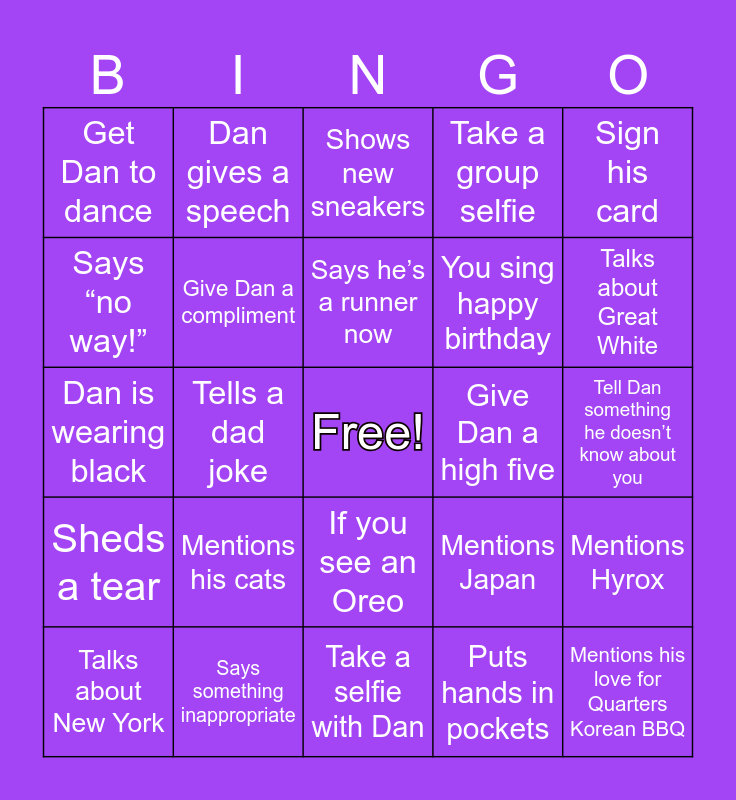 This bingo card has a free space and 27 words: Mentions Japan, Says pickleball, You sing happy birthday, Take a selfie with Dan, Says “no way!”, Shows new sneakers, Dan gives a speech, Sheds a tear, Give Dan a high five, Mentions Hyrox, Dan is wearing black, Take a group selfie, Talks about New York, Says something inappropriate, Talks about Great White, Mentions go karting, Give Dan a compliment, Says he’s a runner now, Mentions his cats, Get Dan to dance, Tell Dan something he doesn’t know about you, Puts hands in pockets, Tells a dad joke, Mentions his love for Quarters Korean BBQ, If you see an Oreo, Sign his card and Dan blows out candles.