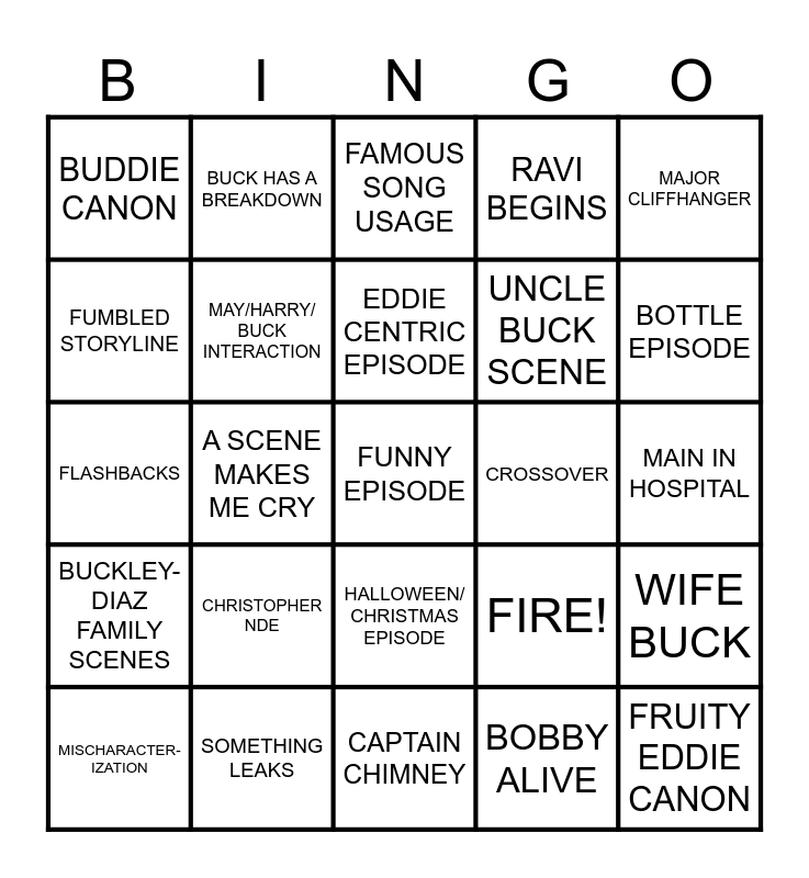 This bingo card has 25 words: CHRISTOPHER NDE, CAPTAIN CHIMNEY, EDDIE CENTRIC EPISODE, MISCHARACTER-IZATION, MAJOR CLIFFHANGER, BUDDIE CANON, FUMBLED STORYLINE, BUCK HAS A BREAKDOWN, CROSSOVER, HALLOWEEN/ CHRISTMAS EPISODE, UNCLE BUCK SCENE, FLASHBACKS, FIRE!, WIFE BUCK, MAY/HARRY/ BUCK INTERACTION, FRUITY EDDIE CANON, MAIN IN HOSPITAL, FAMOUS SONG USAGE, BOTTLE EPISODE, A SCENE MAKES ME CRY, FUNNY EPISODE, SOMETHING LEAKS, BUCKLEY-DIAZ FAMILY SCENES, RAVI BEGINS and BOBBY ALIVE.