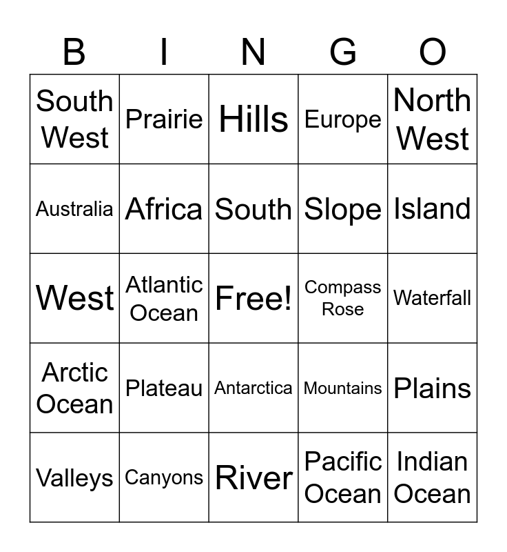 This bingo card has a free space and 35 words: Asia, North America, South America, Africa, Antarctica, Europe, Australia, North, South, East, West, North West, North East, South East, South West, Compass Rose, Pacific Ocean, Atlantic Ocean, Arctic Ocean, Indian Ocean, Mountains, Valleys, Plains, Canyons, Hills, Island, Volcano, Cliff, Slope, Waterfall, Lake, River, Plateau, Prairie and 5 items.