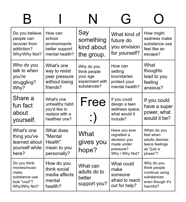 This bingo card has a free space and 24 words: What does "Mental Health" mean to you personally?, How do you think social media affects mental health?, Why do you think people your age experiment with substances?, Do you think movies/music make substance use look "cool"? Why/Why Not?, How might sadness make substance use feel like an escape?, Do you believe people can recover from addiction? Why/Why Not?, Who do you talk to when you're struggling? Why?, How can school environments better support mental health?, If you could design a teen wellness space, what would it include?, What gives you hope?, How can setting boundaries protect your mental health?, Share a fun fact about yourself., Have you ever regretted a decision you made under pressure? Why / Why Not?, When do you feel when adults dismiss teens feelings as "just a phase"?, What's one way to resist peer pressure without losing friends?, What could make someone afraid to reach out for help?, If you could have a super power, what would it be?, Say something kind about the group., What thoughts lead to you feeling anxious?, What's one unhealthy habit you'd like to replace with a healthier one?, Why do you think people continue using substances even though it's harmful?, What's one thing you've learned about yourself while here?, What kind of future do you envision for yourself? and What can adults do to better support you?.