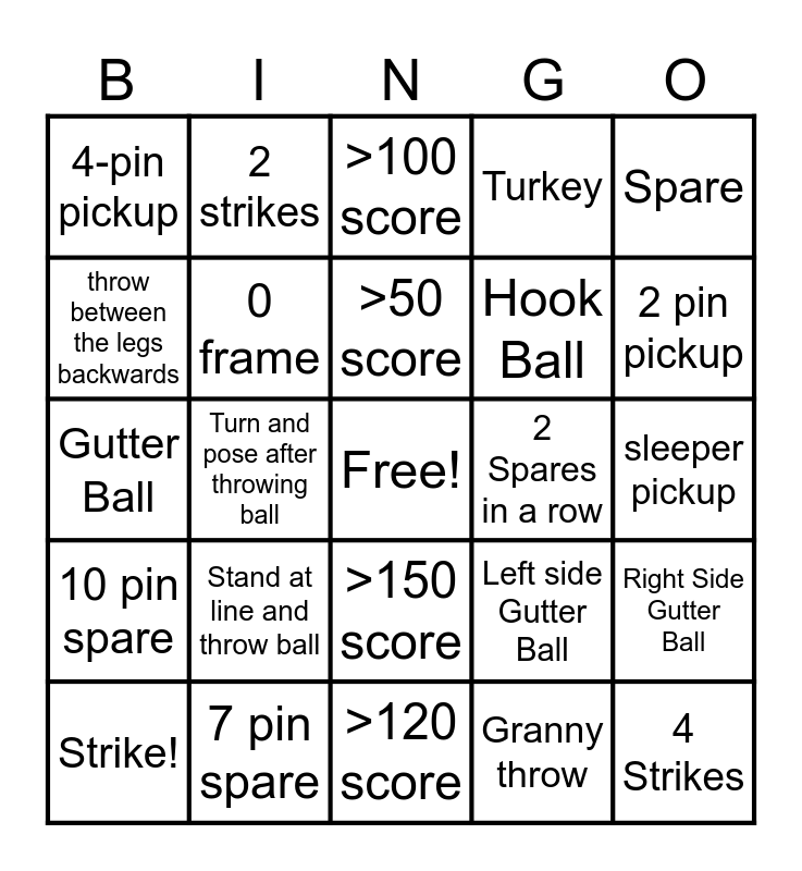 This bingo card has a free space and 24 words: Strike!, Stand at line and throw ball, >50 score, Granny throw, Spare, 4-pin pickup, 2 strikes, >100 score, 2 Spares in a row, sleeper pickup, Gutter Ball, 0 frame, Left side Gutter Ball, Right Side Gutter Ball, throw between the legs backwards, 7 pin spare, >120 score, Turkey, 2 pin pickup, 10 pin spare, Turn and pose after throwing ball, >150 score, Hook Ball and 4 Strikes.