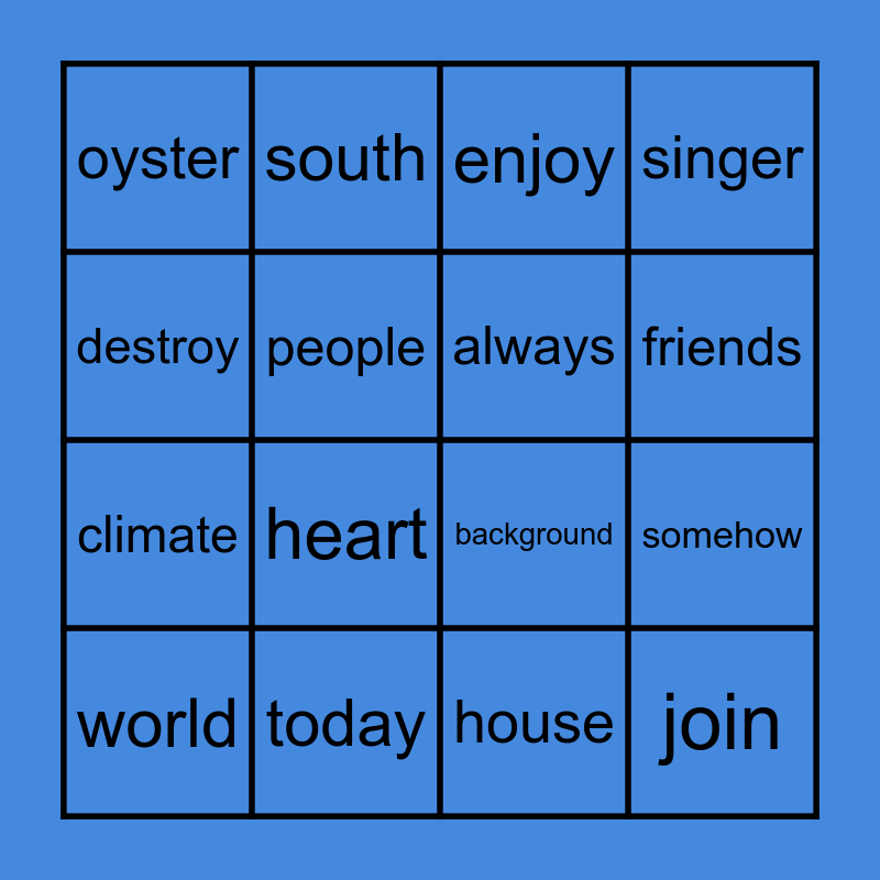This bingo card has 19 words: background, downtown, enjoy, join, somehow, destroy, house, oyster, south, climate, heart, people, always, today, world, proud, singer, friends and twice.