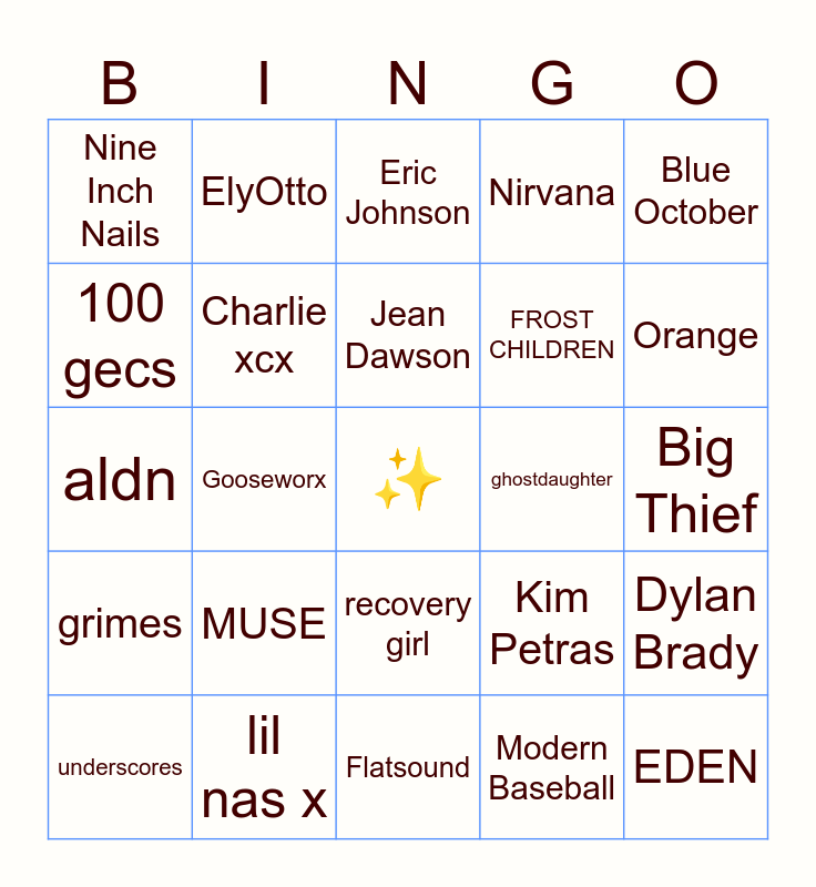 This bingo card has a free space and 24 words: MUSE, lil nas x, Jean Dawson, underscores, Blue October, Nine Inch Nails, 100 gecs, ElyOtto, ghostdaughter, recovery girl, FROST CHILDREN, aldn, Kim Petras, Dylan Brady, Charlie xcx, Modern Baseball, Big Thief, Eric Johnson, Orange, Gooseworx, EDEN, grimes, Nirvana and Flatsound.