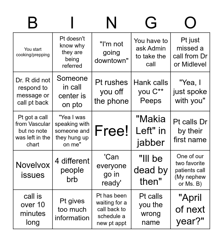 This bingo card has a free space and 27 words: "Ill be dead by then", Mispronounce Dr's name, Hank calls you C** Peeps, Pt has been waiting for a call back to schedule a new pt appt, Dr. R did not respond to message or call pt back, "I'm not going downtown", Pt doesn't know why they are being referred, Novelvox issues, "Makia Left" in jabber, One of our two favorite patients call (My nephew or Ms. B), Pt got a call from Vascular but no note was left in the chart, You have to ask Admin to take the call, call is over 10 minutes long, Pt gives too much information, "Yea, I just spoke with you", Staffing update email from Med Onc, Someone in call center is on pto, Pt rushes you off the phone, 4 different people brb, You start cooking/prepping, Pt calls Dr by their first name, Pt calls you the wrong name, "Yea I was speaking with someone and they hung up on me", "April of next year?", 'Can everyone go in ready', Pt just missed a call from Dr or Midlevel and irate patient.