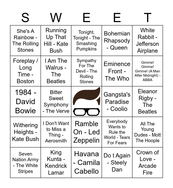 This bingo card has a free space and 40 words: Brave New World - Iron Maiden, 1984 - David Bowie, Cassandra - ABBA, I Am The Walrus - The Beatles, King Kunta - Kendrick Lamar, Ramble On - Led Zeppelin, Sympathy For The Devil - The Rolling Stones, The Tortured Poets Department - Taylor Swift, White Rabbit - Jefferson Airplane, Withering Heights - Kate Bush, Bitter Sweet Symphony - The Verve, Bohemian Rhapsody - Queen, Crown of Love - Arcade Fire, Eleanor Rigby - The Beatles, Gangsta's Paradise - Coolio, I Don't Want to Miss a Thing - Aerosmith, Kashmir - Led Zeppelin, She's A Rainbow - The Rolling Stones, Strange Magic - Electric Light Orchestra, Tonight, Tonight - The Smashing Pumpkins, All The Young Dudes - Mott The Hoople, Do t Again - Steely Dan, Eminence Front - The Who, Foreplay / Long Time - Boston, Hold The Line - TOTO, Never Going Back Again - Fleetwood Mac, Right Down The Line - Gerry Rafferty, Rock and Roll - Led Zeppelin, Soul Kitchen - The Doors, Stay With Me - Faces, All Star - Smash Mouth, Seven Nation Army - The White Stripes, Boulevard of Broken Dreams - Green Day, Everybody Wants to Rule the World - Tears For Fears, Gimme! Gimme! Gimme! (A Man After Midnight) - ABBA, Havana - Camila Cabello, House of the Rising Sun - The Animals, Pumped Up Kicks - Foster The People, Running Up That Hill - Kate Bush and Smells Like Teen Spirit - Nirvana.