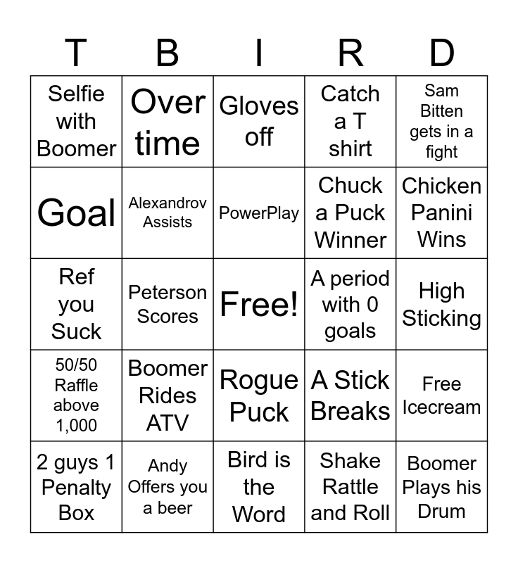This bingo card has a free space and 24 words: Boomer Rides ATV, Andy Offers you a beer, PowerPlay, 2 guys 1 Penalty Box, Sam Bitten gets in a fight, Selfie with Boomer, Goal, Over time, A period with 0 goals, Rogue Puck, Chuck a Puck Winner, Ref you Suck, A Stick Breaks, Free Icecream, Alexandrov Assists, Shake Rattle and Roll, High Sticking, Gloves off, Chicken Panini Wins, Peterson Scores, Boomer Plays his Drum, 50/50 Raffle above 1,000, Catch a T shirt and Bird is the Word.
