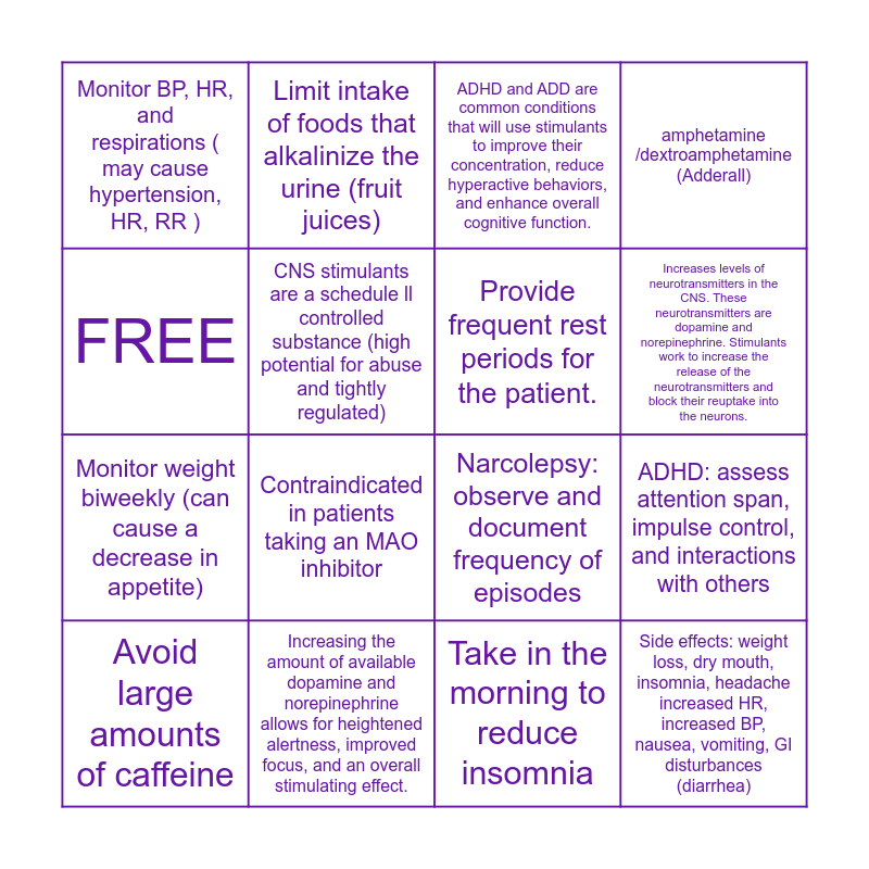 This bingo card has 16 words: Increasing the amount of available dopamine and norepinephrine allows for heightened alertness, improved focus, and an overall stimulating effect., ADHD: assess attention span, impulse control, and interactions with others, ADHD and ADD are common conditions that will use stimulants to improve their concentration, reduce hyperactive behaviors, and enhance overall cognitive function., Monitor BP, HR, and respirations ( may cause hypertension, HR, RR ), Monitor weight biweekly (can cause a decrease in appetite), Limit intake of foods that alkalinize the urine (fruit juices), Narcolepsy: observe and document frequency of episodes, Take in the morning to reduce insomnia, FREE, CNS stimulants are a schedule ll controlled substance (high potential for abuse and tightly regulated), Avoid large amounts of caffeine, amphetamine /dextroamphetamine (Adderall), Contraindicated in patients taking an MAO inhibitor, Increases levels of neurotransmitters in the CNS. These neurotransmitters are dopamine and norepinephrine. Stimulants work to increase the release of the neurotransmitters and block their reuptake into the neurons., Provide frequent rest periods for the patient. and Side effects: weight loss, dry mouth, insomnia, headache increased HR, increased BP, nausea, vomiting, GI disturbances (diarrhea).