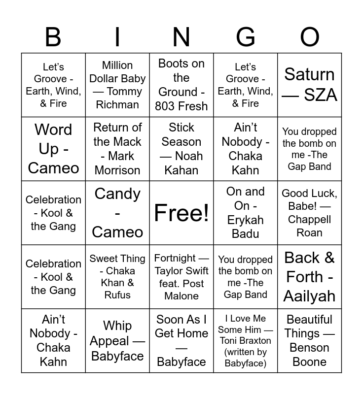 ⚠ This card has duplicate items: Word Up - Cameo (2), Candy - Cameo (2), Let’s Groove - Earth, Wind, & Fire (2), September - Earth, Wind, & Fire (2), Sweet Thing - Chaka Khan & Rufus (2), Ain’t Nobody - Chaka Kahn (2), You dropped the bomb on me -The Gap Band (2), Celebration - Kool & the Gang (2), Ladies Night - Kool & the Gang (2), This is how we do it - Montell Jordan (2), Return of the Mack - Mark Morrison (2), No Diggity - Blackstreet (2), Are you that somebody - Aailyiah (2), Back & Forth - Aailyah (2), Try Again - Aailyah (2), Boots on the Ground - 803 Fresh (2), On and On - Erykah Badu (2), Whip Appeal — Babyface (2), Every Time I Close My Eyes — Babyface (2), When Can I See You — Babyface (2), For the Cool in You — Babyface (2), Soon As I Get Home — Babyface (2)